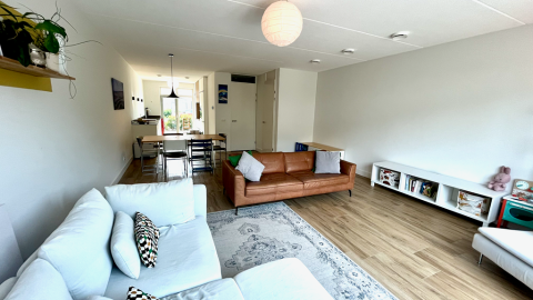 Entree in voortuin met deur naar de hal. Apart toilet met kraan, trap en deur naar de ruime woonkamer. De woonkamer heeft een open keuken met inbouwapparatuur zoals vaatwasser, inductiekookplaat met afzuigkap, koelkast en vriezer, Quooker en voldoende opbergruimte. Zonnige tuin vanuit de woonkamer met schuur en poorten naar de eigen parkeerplaats.