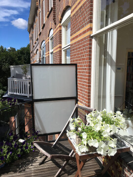 1st floor: Hall with separate toilet and access to the living room and kitchen at the rear. The attractive kitchen is equipped with all necessary equipment. Spacious bright living room en suite with nice dimensions (approx. 9.8 x 3.8 m) and both a terrace at the front (southwest) and at the rear (northeast), so if desired ‐ at any time of the day the sun can be enjoyed. The dining (approx. 3.4 x 3.8 m) at the rear has French doors to the balcony with morning sun and can be separated from the living room at the front by sliding doors. The dining room has a passage to the kitchen. The spacious front room (approx. 6.4 x 3.8 m) gives access to the side room (approx. 2.8 x 2.0 m) with fixed bookcases. The deep terrace with afternoon and evening sun is accessible from the front room.