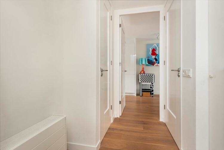Ruime overloop, badkamer, twee slaapkamers en trapopgang naar de tweede verdieping. Aan de voorzijde ligt een van de slaapkamers en de badkamer voorzien van een ligbad, inloop regendouche, toilet en wastafel. Aan de achterzijde bevindt zich de hoofdslaapkamer met royale inloopkast die half afgesloten is van de slaapkamer.