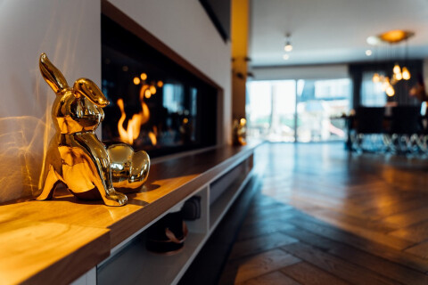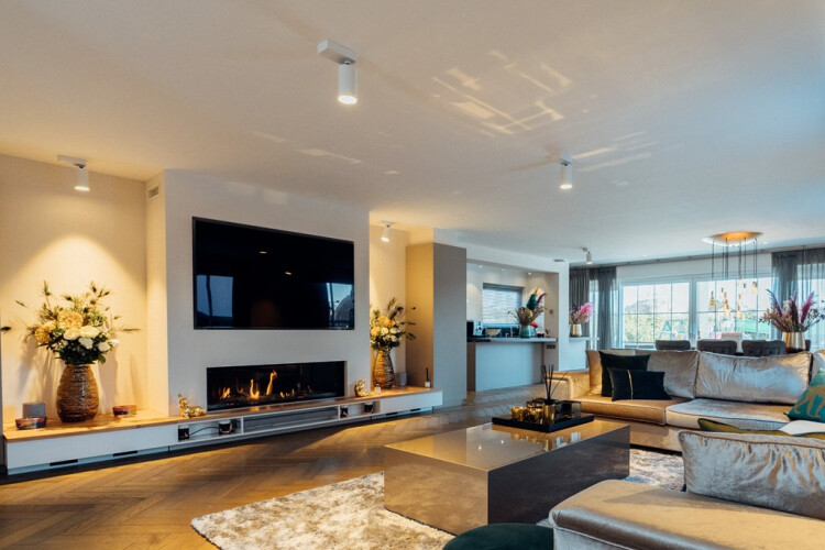 Entree via een ruime ontvangsthal, in deze ruimte bevindt zich een garderobekast en gastentoilet met Toto Washlet SG met automatisch wc-bril (inclusief afstandsbediening) en wastafel met spiegel infrarood schakelaar. De hal geeft toegang naar de sfeervolle en ruim opgezette woonkamer en leefkeuken. De woonkamer heeft als eyecatcher een panoramisch vuurzicht met een tunnelhaard van 150 cm, welke naast sfeer ook behoorlijk wat warmte in het midden van de ruimte geeft.