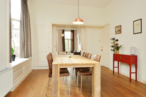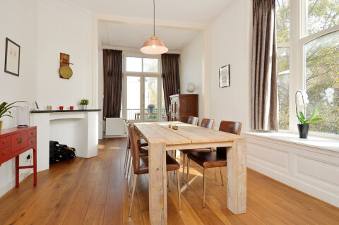 Overloop met ruime voorraadkast en toilet met fontein. De slaapkamer aan de voorzijde gelegen (ca. 2.20 x 2.10) is ideaal te gebruiken als studeer- of speelkamer. De riante woon-/eetkamer en-suite (ca. 6.65 x 3.75) aan de voorzijde van de woning is voorzien van 4 inbouwkasten, een fraaie erker en een charmante open haard. De eetkamer (ca. 6.10 x 3.75) is gelegen aan de achterzijde van de woning is voorzien van en zij-erker en een sierschouw. Vanuit de eetkamer bereikt u het aan de achterzijde gelegen dakterras (ca. 3.00 x 3.00). De semi- open keuken in L-opstelling (ca. 4.25 x 2.2/3.05) is voorzien van diverse inbouwapparatuur zoals koelkast, vriezer, vaatwasser, oven, gasfornuis, afzuigkap en is afgewerkt met een composiet werkblad. De gehele 1e verdieping is voorzien van een mooie houten parketvloer.
