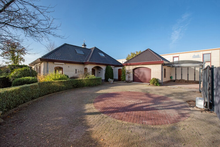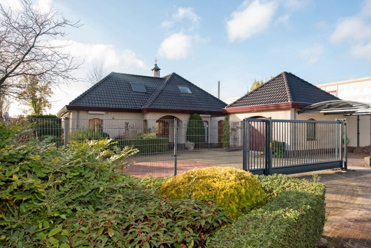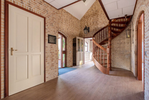Elektrische poort geeft toegang tot het terrein, welke middels hekwerk volledig is afgesloten. Entree woning, ruime hal met dakraam (incl. elektrische rolluik), ingebouwde nis met garderobe, toegang tot ruime moderne keuken van ca.: 3,3 x 4 voorzien van inbouw apparatuur (inductie kookplaat, afzuigkap, vaatwasser, 2x combi magnetron/oven, koel/vries combinatie), inbouw zeepdispenser en Quooker.