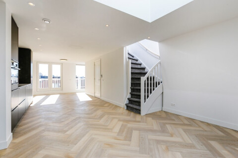 3e verdieping: Separaat toilet met wastafel. Ruime en lichte woonkamer met open keuken en openslaande deuren naar een zonnige balkon. Keuken voorzien van luxe inbouw apparatuur (Bora kooplaat en Siemens apparatuur), Quooker, oven, magnetron, vaatwasser, koelkast en vriezer. Vaste open trap naar het ruime zonnige dakterras met zicht over de skyline van Den Haag.