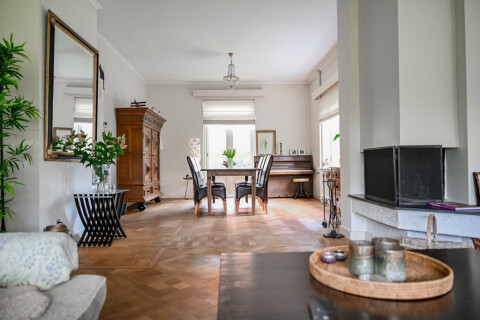 A grande living room situated over the totality of the ground floor. On the hallway the toilet, access to the basement and kitchen.