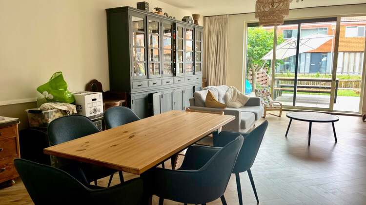 Entrance to a hallway with toilet with faucet. Doors to the spacious living room which is stylishly decorated and has floor heating. Sliding doors to the green garden with garden furniture. Open kitchen with spacious freezer and fridge, oven, microwave, dish washer, and boiling water tap.