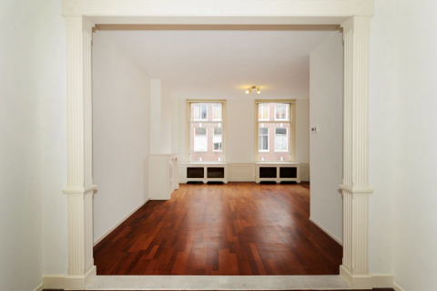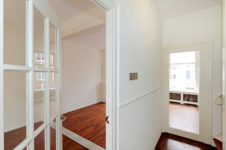 Entree op straatniveau, gang met meterkast, binnentrap naar eerste etage met een centrale overloop. Sfeervolle woon-/eetkamer (voormalig en suite) met originele details zoals glas & lood. De keuken is voorzien van inbouw apparatuur o.a. koelvrieskast, kookplaat, oven en afzuigkap.